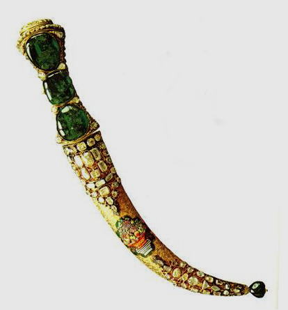 その後中世に近づくと、戦いに勝利した者がその強さを示すために武器を宝石で飾るようになる。本来の機能を失った武具が多く造られるようになったのはこのころかな。スルタンの宝剣なんて、柄にでっかいエメラルドが何個もはめ込まれて握ることすらできない。