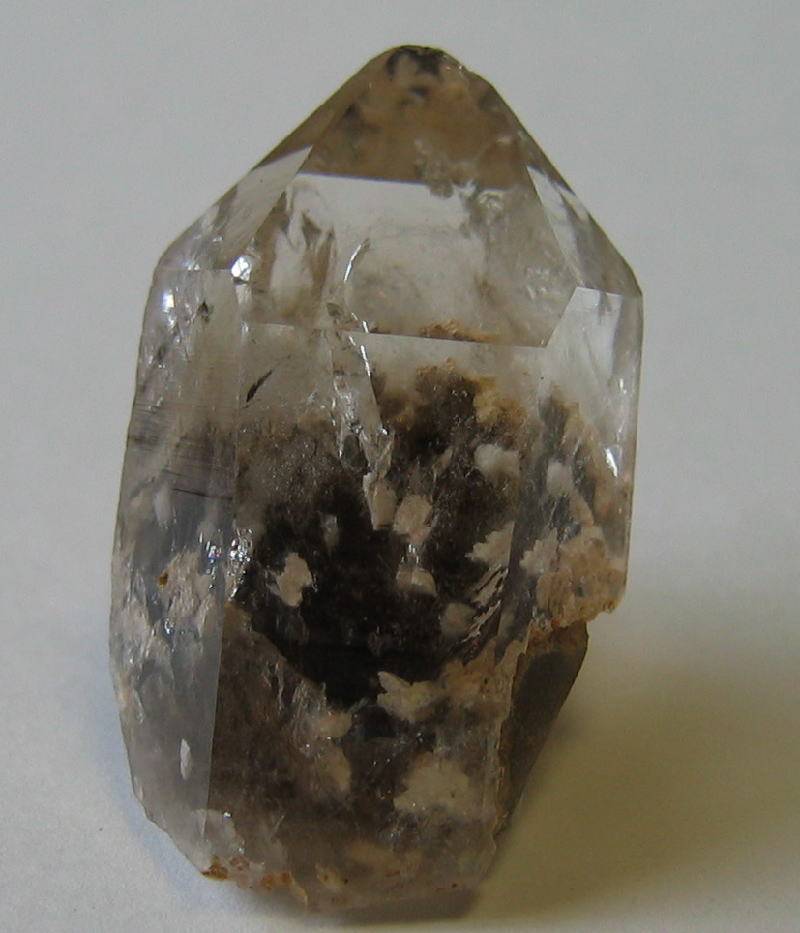 透明な水晶の中に煙水晶がいる。白いツブツブは長石だといわれている。