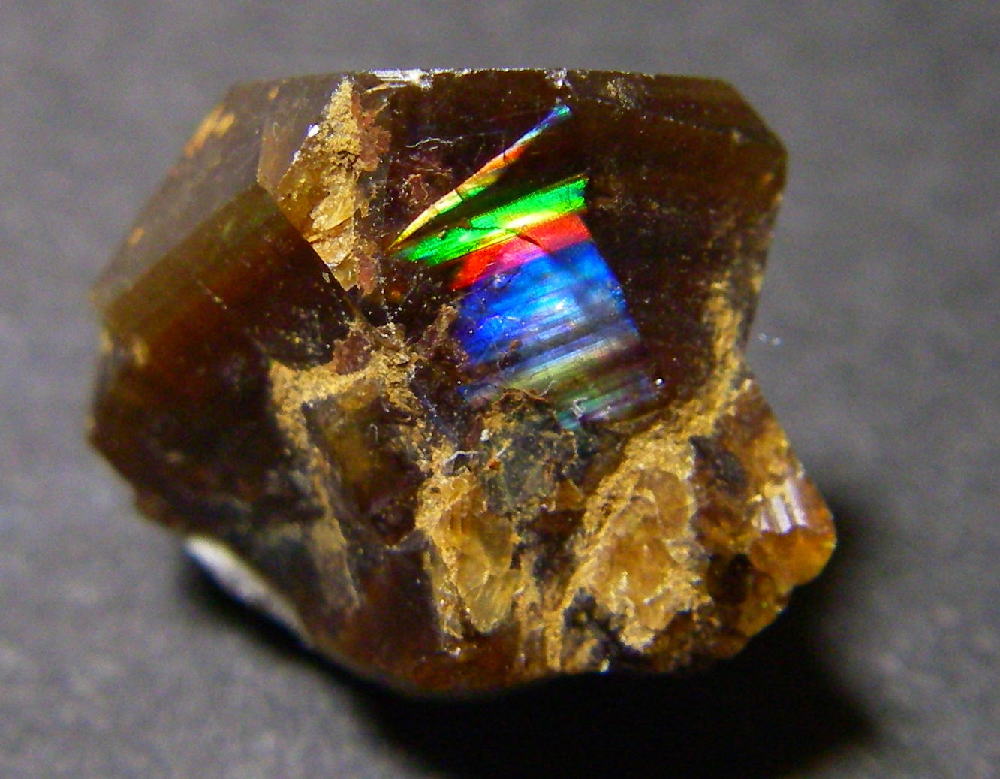 表面が七色に光るこの石は世界にもほとんどない。一般的にいうレインボーは結晶のヒビに光が干渉して見えるものだったけど、このガーネットはヒビなんかなくても結晶自体がレインボーを発生する構造になっている。