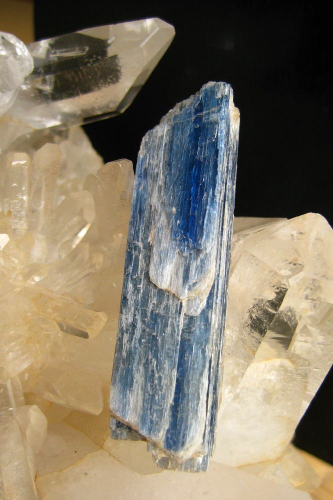 原石を手に取ってみると一目瞭然。非常に薄いカイヤナイトの板状結晶が何万枚も何億枚も張り合わされたようになっていて、爪でコリコリっとすると雲母(うんも)のように簡単にはがれてしまう。それがスジの原因。