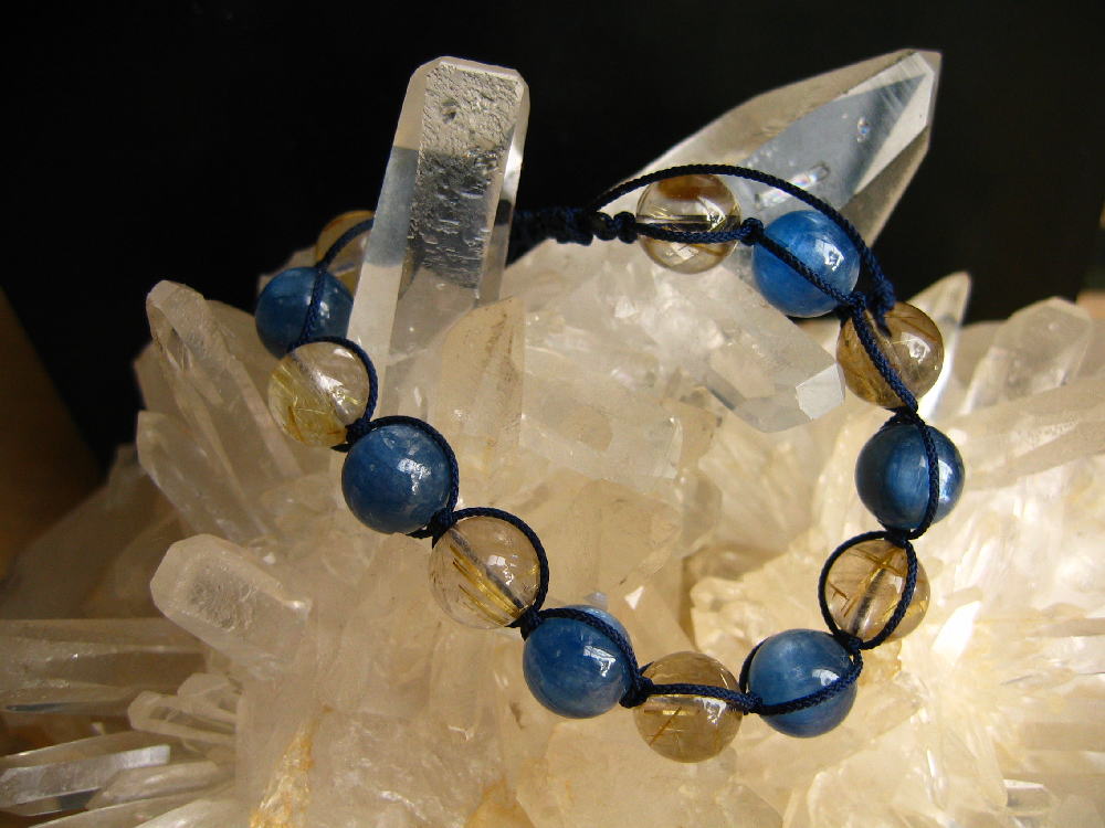 下の写真はカイヤナイトとルチルクオーツでウチのカミさんが自作したブレスレット。
