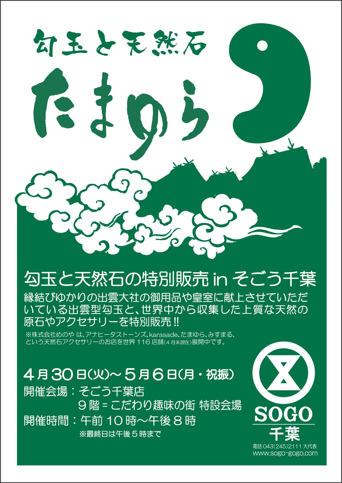トップページ > 新着情報 > 千葉そごうにて勾玉と天然石の特別販売をいたします【4月30日~5月6日まで】
