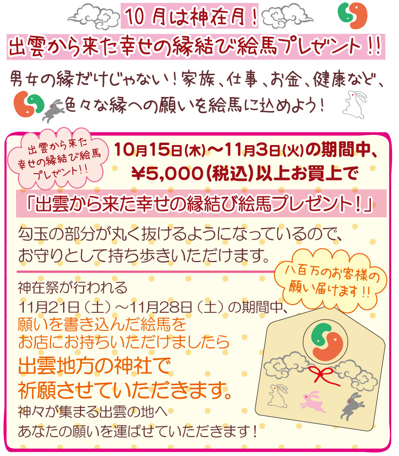 10月は神在月!出雲から来た幸せの縁結び絵馬プレゼント!!10月15日(木)~11月3日(火)の期間中、税込み5,000円以上お買い上げで出雲から来た幸せの縁結び絵馬プレゼント!神在月が行われる11月21日~28日期間中、願いを書き込んだ絵馬をお店にお持ちいただけましたら出雲地方の神社で祈願させていただきます。