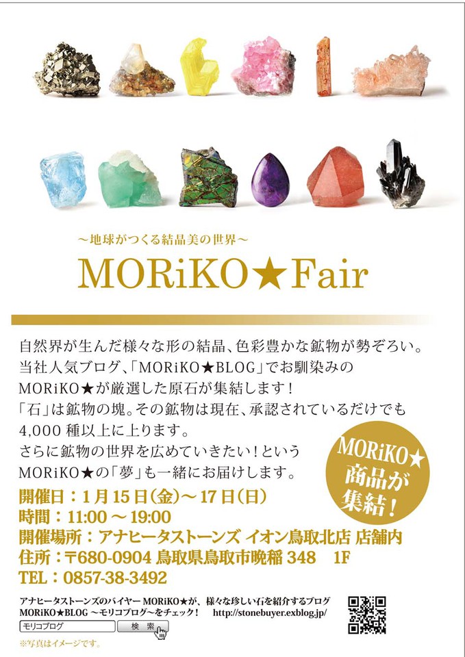 MORiKO★Fair開催日: 1月15日(金)~17日(日)開催時間: 11:00~19:00開催場所: アナヒータストーンズ イオン鳥取北店 店舗内
