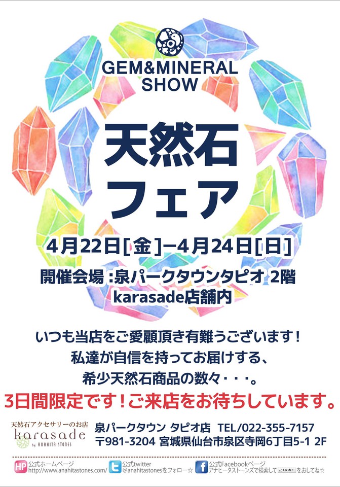 皆さまのご来店をスタッフ一同心よりお待ちしております!!★ミネラルショー開催【開催日】4月22日(金)~24日(日)【開催会場】タピオ南館2階 karasadeタピオ店 店内