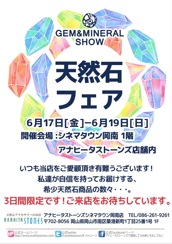 石好きの皆さま必見☆☆普段店頭に並ばない珍しい天然石が大集合です!3日間限定イベント!!【開催会場】シネマタウン 岡南 1階 アナヒータストーンズ店舗内【開催日】6月17日(金)~6月19日(日)