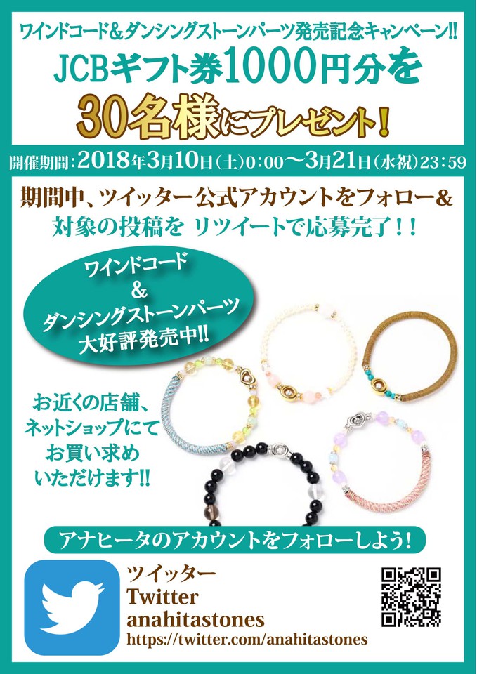 ワインドコード&ダンシングストーンブレスレットパーツは全国のアナヒータストーンズ&からさでで好評発売中!
