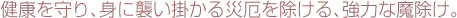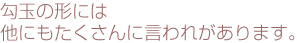 | 魔除けの形 | 曲がった「カギ型」に魔を遠ざける力がある。もしくは首飾りにすると勾玉の尾は外側に向かって突き出すのでこれに悪しき物をさけ、身を守る威力がある |