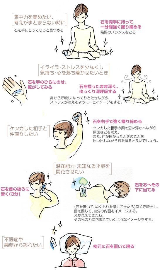 お店で「タンブル」「マルダマ」などとして取り扱っている石、通称「お守りストーン」。部屋に飾ってみたり、かばんに入れて持ち歩いてみるほかに出来る「おまじない」をご紹介します。 天然石(パワーストーン)を持つときには、新たな気持ちで持ち始めるため、きちんとお手入れをしてあげると良いでしょう。また、活用後には天然石(パワーストーン)もきっと疲れていると思いますので、ケアすることをお勧めします。