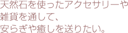 アナヒータストーンズ(Anahita Stones)は、半貴石を使い、自然素材を大切にしたブレスレットやシルバーなどのアクセサリー・雑貨を通して、お客様に毎日の生活の中に少しでも安らぎや愉しさを感じていただければ・・・という想いのもと、縁結びの地、出雲から全国に展開中です。