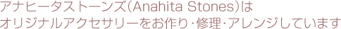 アナヒータストーンズ(Anahita Stones)では、店内に置いてある商品の他に、お客さまの好きな天然石やラッキーカラーを使ったオリジナルアクセサリー(ブレスレットやストラップなど)をその場でオーダーでき、ハンドメイドでお作りしています。人気の天珠や梵字、キラキラのラインストーンパーツなどを組み合わせて作るデザインは無限大!また、長く愛用していただきたいという想いから、使っているうちにのびたり切れたりしたものは、お直しや違うアクセサリーへのアレンジも承っております。