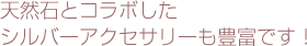 シルバーは天然石の魅力を引き出してくれるといわれることから相性が良いと言われています。ピアスやネックレスでお洒落を楽しみながら、天然石を身につけていただけます。メッセージの入ったものや、刻印を入れられるものもありますので、大切な人や仲間とのお互いの気持ちを確かめ合うアイテムとしてもお選び下さい。